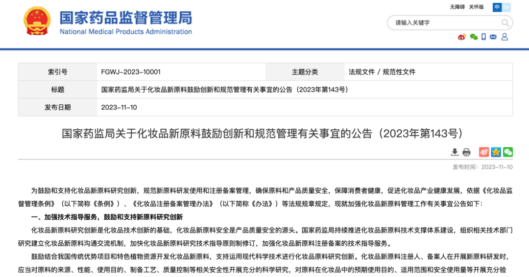 11月10日,国家药监局发布了关于化妆品新原料鼓励创新和规范管理有关事宜的公告,主要从以下3个方面规范新原料研发和注册备案管理: