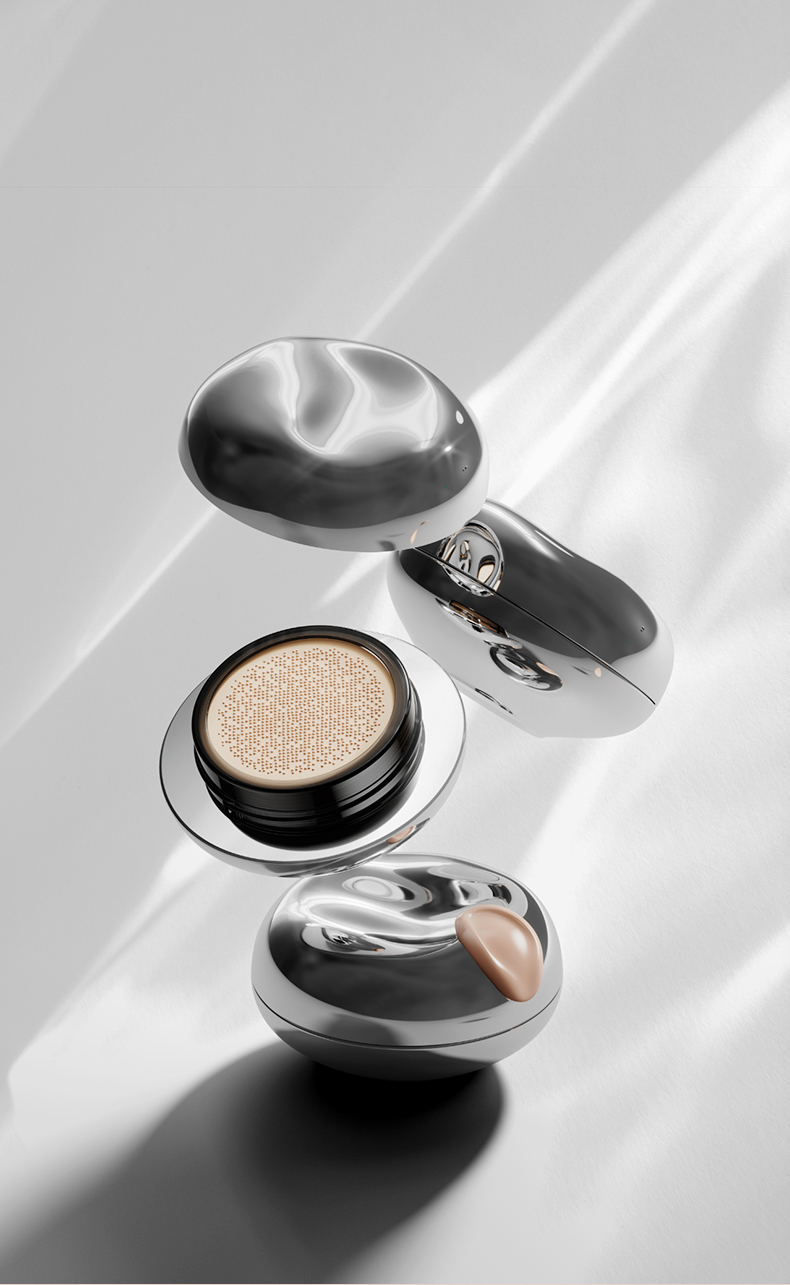球形粉体与片状云母双重粉体交织,轻盈填充肌肤纹理,融合自然与科技力量,将金与蓝宝石粉调和入妆,使肌肤由内而外散发光芒。