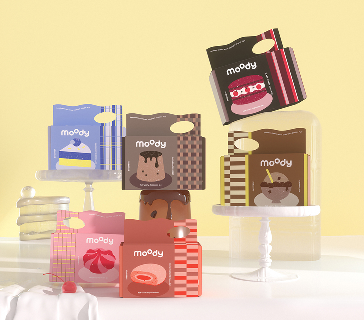 moody于本月初推出全新半年抛款美瞳——甜心贩卖机,该系列以香甜软糯的甜点为灵感打造。包装盒上均影印着与美瞳配色相似的甜品图案,甜美可爱。