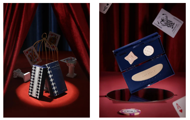 尔木萄将魔法师化为灵感,集结扑克牌、魔术箱等多种元素,打造全新立体光影三色修容盘,其外观酷似魔术箱,内含修容、哑光高光、珠光高光三色。